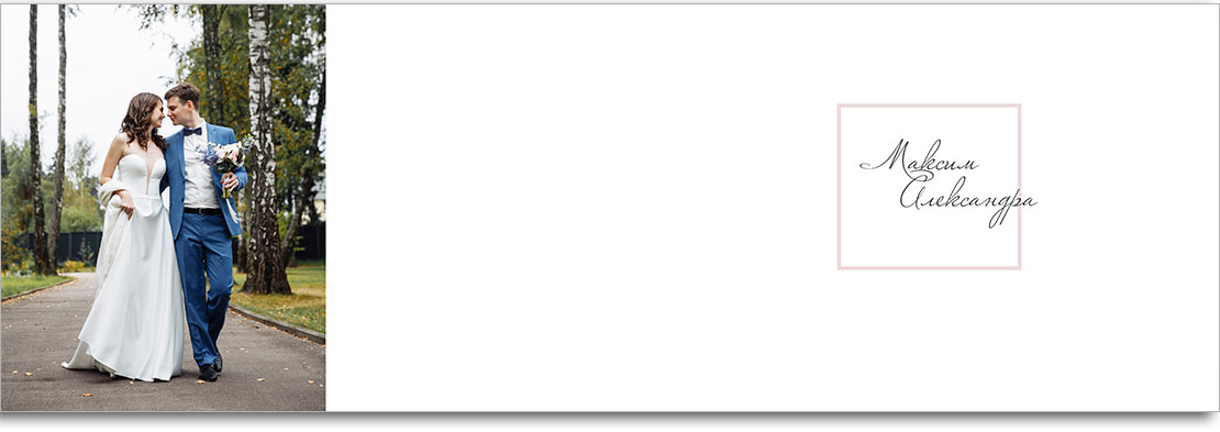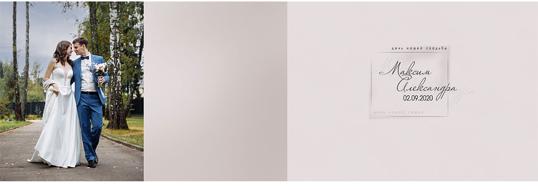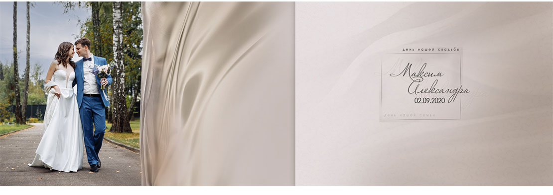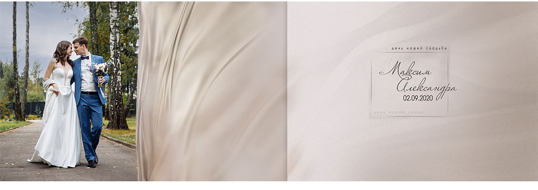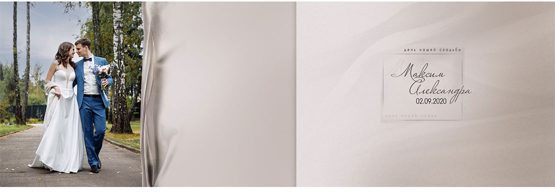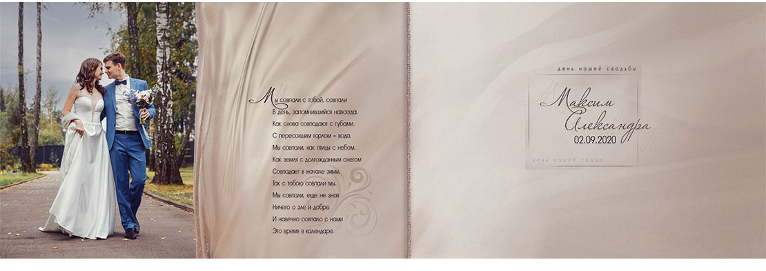 До начала работы над дизайном мы изучаем исходные фотографии, так как проект книги должен продолжать идею свадьбы и фотосъемки. Здесь на свадебных фотографиях использовано минималистичное декорирование, без ярких акцентов. Первоначально приходит мысль взять какой-то элемент или цветовую гамму свадьбы – например, синий пиджак жениха. Но это сделать гармонично не получилось. Потому пришла идея взять за основу декора матовую фактуру платья невесты, на которую хорошо ложились не только фотоснимки, но и тексты стихотворений.