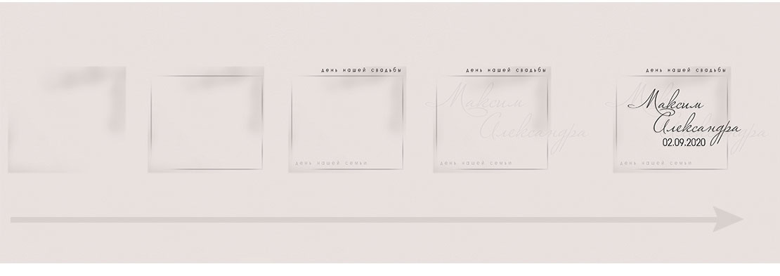 Дизайнер послойно создает каждый элемент фотокниги. В данном случае ее начало – оформление первого разворота с именами и датой свадьбы.