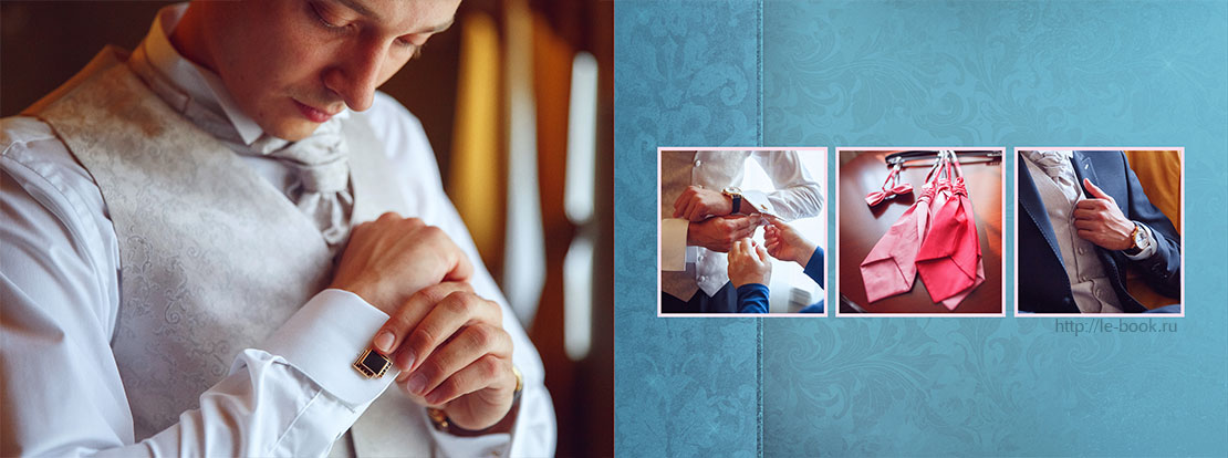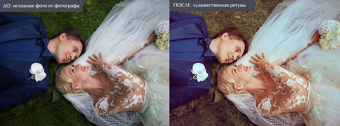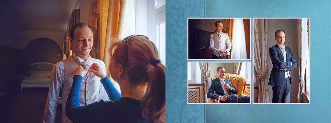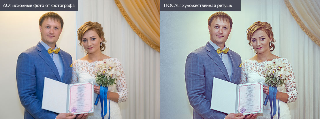 Как минимум, фотографии нужно привести к одной цветовой гамме. Особое внимание обратить на цвет пиджака жениха! Бывают ткани, меняющие цвет в зависимости от освещения, что в свадебной фотокниге будет восприниматься как неаккуратная работа. Часто фотографы в потоковой обработке не обращают на него внимания, ставя в приоритет цвет лица и платья невесты.